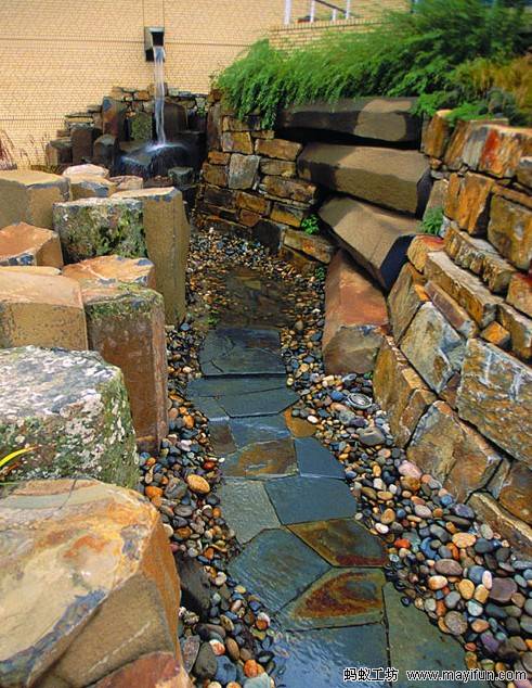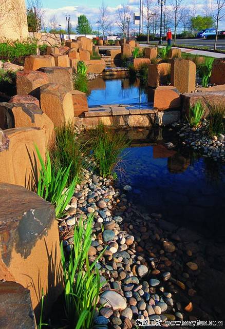 你也許會(huì )問(wèn),藝術(shù)在哪里?雨水打造的水體景觀(guān)的建筑表達方式是什么??jì)?yōu)秀的設計能否將雨水利用和運用雨水本身所形成的融合建筑體驗的“場(chǎng)所創(chuàng )造”聯(lián)系在一起?答案是肯定的。一些富有創(chuàng )造力的景觀(guān)設計師已經(jīng)發(fā)現雨水所蘊含的藝術(shù)潛能。就像我上面說(shuō)的一樣,關(guān)鍵是表達出雨水在整個(gè)設計中的獨特動(dòng)感之美。景觀(guān)設計師史蒂夫·科赫為波特蘭的一座公寓設計的庭院景觀(guān)就是一個(gè)典范??坪盏脑O計將屋頂雨水收集起來(lái),水流在高低錯落的水道中歡快地跳躍著(zhù),最后注入巖石圍筑的水池。水池下是一個(gè)用于收集雨水的蓄水池。值得注意的是科赫的這個(gè)成功作品還借鑒了印度傳統的建筑圖騰。景觀(guān)設計師在利用雨水打造水體景觀(guān)時(shí),要充分學(xué)習當地傳統文化,將其有效地運用到設計中。