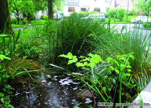 一項日益盛行的利用雨水打造水體景觀(guān)的重要創(chuàng )新之舉就是采用“綠色街道”。所謂“綠色街道”就是通過(guò)入滲池、雨水花園以及街道與人行道之間常有的淺溝來(lái)收集雨水。就像本文所提到的其他景觀(guān)設施一樣,“綠色街道”同樣也有效地減輕了市政排水系統的壓力。波特蘭已將這種功能性的“綠色街道”作為城市正在實(shí)施的示范項目。一般來(lái)說(shuō),“綠色街道”設在現有城市肌理的隱蔽處或縫隙處,如學(xué)校周?chē)?、停?chē)場(chǎng)、林蔭大道、雜貨店入口或住宅區的停車(chē)位。它們仿佛是現代城市中冰冷堅硬的街道及停車(chē)場(chǎng)中的“星星之火”,為城市搭建起一條處理城市雨水的生態(tài)體系。在典型的“綠色街道”中,雨水在排水溝中流經(jīng)整條街道,最后注入一系列種有植被的洼地,雨水在這里經(jīng)植物凈化滲入土壤。降水量大的時(shí)候,多余的雨水則排入傳統的城市排水系統中。