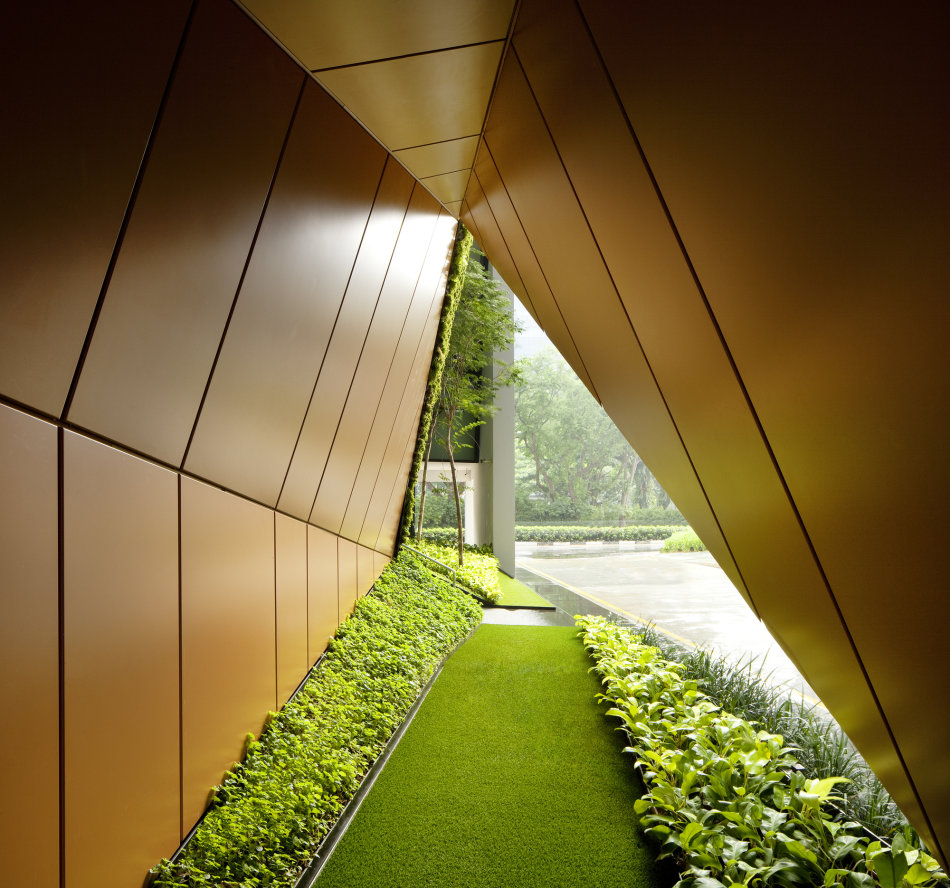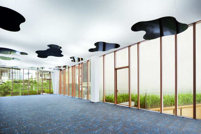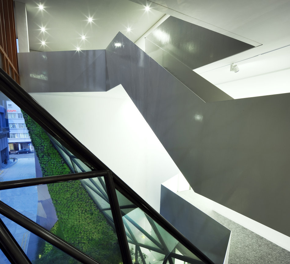 As the original floor levels with their low ceiling heights were retained, the front end of the shophouses was deemed more suitable for meeting rooms, while the service end accommodated a mechanised carpark. The idea was to strategically lift up the open plan offices within the upper 4 floors where the floor plate size is maximised, higher headroom is gained, better views are enjoyed and more natural daylight is accessed from the sides. Every flat roof area is also transformed into roof gardens with the attic featuring the office’s recreational lounge from which unblocked panoramic views of Hong Lim Park and PARKROYAL on Pickering Hotel can be enjoyed.