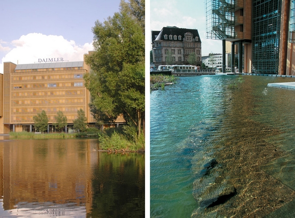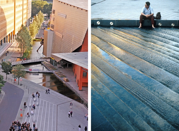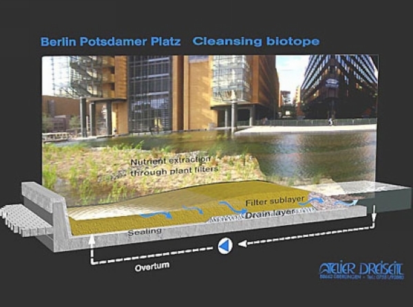 這一城市水景設計之中蘊含的理念即為,雨水在降落之地即應被就地使用。在波茨坦廣場(chǎng),綠化屋頂和非綠化屋頂的結合設計可以獲取全年降雨量。雨水從建筑屋頂流下,作為沖廁、灌溉和消防用水。過(guò)量的雨水則可以流入戶(hù)外水景的水池和水渠之中,為城市生活增色添彩。