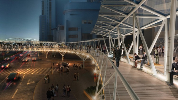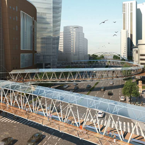 龍之翼是一個(gè)長(cháng)達1.5公里的空中步行系統,包含一個(gè)空中廣場(chǎng)和一組跨度70米的桁架,貫穿上海中山公園地塊最繁華的購物區。Arup Associates是該項目國際競標的優(yōu)勝者,設計的主旨是打造一個(gè)天橋及空中平臺,不僅將高密度商業(yè)中心串聯(lián)起來(lái),同時(shí)解決該地區繁雜的公共交通問(wèn)題。這個(gè)系統連接了兩條地鐵線(xiàn)、多個(gè)購物中心和中山公園前廣場(chǎng)。設計團隊認真開(kāi)展了實(shí)地分析和行人流量研究,從使用者的角度出發(fā),充分考慮可達性和無(wú)障礙設計,將此核心商業(yè)區打造成一個(gè)方便行人活動(dòng)的區域。