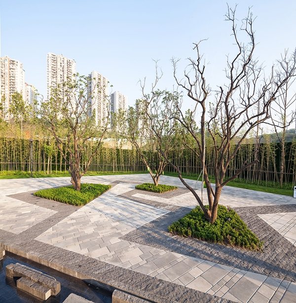 綿延的山峰、四川盆地的山谷、水稻梯田、蜿蜒的長(cháng)江和重慶灰白薄霧彌漫的神秘天際在公園周?chē)纬闪司薹淖匀槐尘?,建立了強烈的視覺(jué)聯(lián)系。
