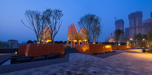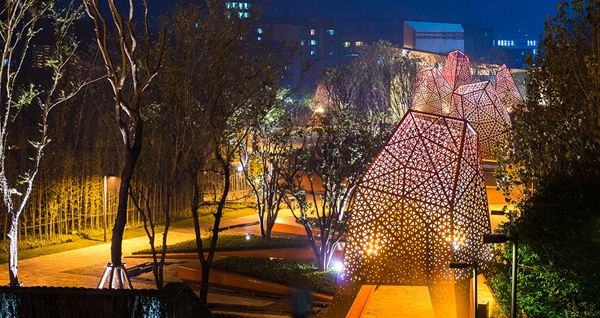 從楓溪路到達公園,入口處排列的舞動(dòng)的紅色和橘色雕塑將游客引向廣場(chǎng)停車(chē)場(chǎng)。第一個(gè)亭子設在入口處,隨著(zhù)亭閣沿山坡一路向下,可以看見(jiàn)延綿不絕的山峰。每個(gè)亭閣都沿著(zhù)“Z”形小道精心布置,將人行步道引向下方的“山巒”,最終到達萬(wàn)科銷(xiāo)售中心區域。白天,亭閣灑下陰涼;夜間,被燈光點(diǎn)亮的亭閣則變身為絢爛的“燈籠”。